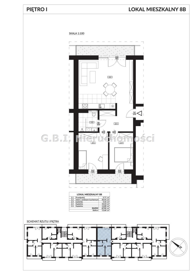Trzypokojowe mieszkanie o powierzchni 67,94 m², położone na 1. piętrze, obejmuje: